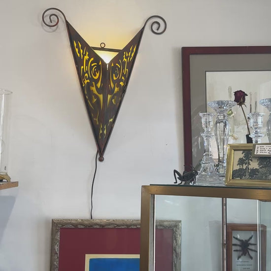 The scone features intricate, cutout design. Has a rustic finish and decorative curls at the top with a wall plug-in cord.
