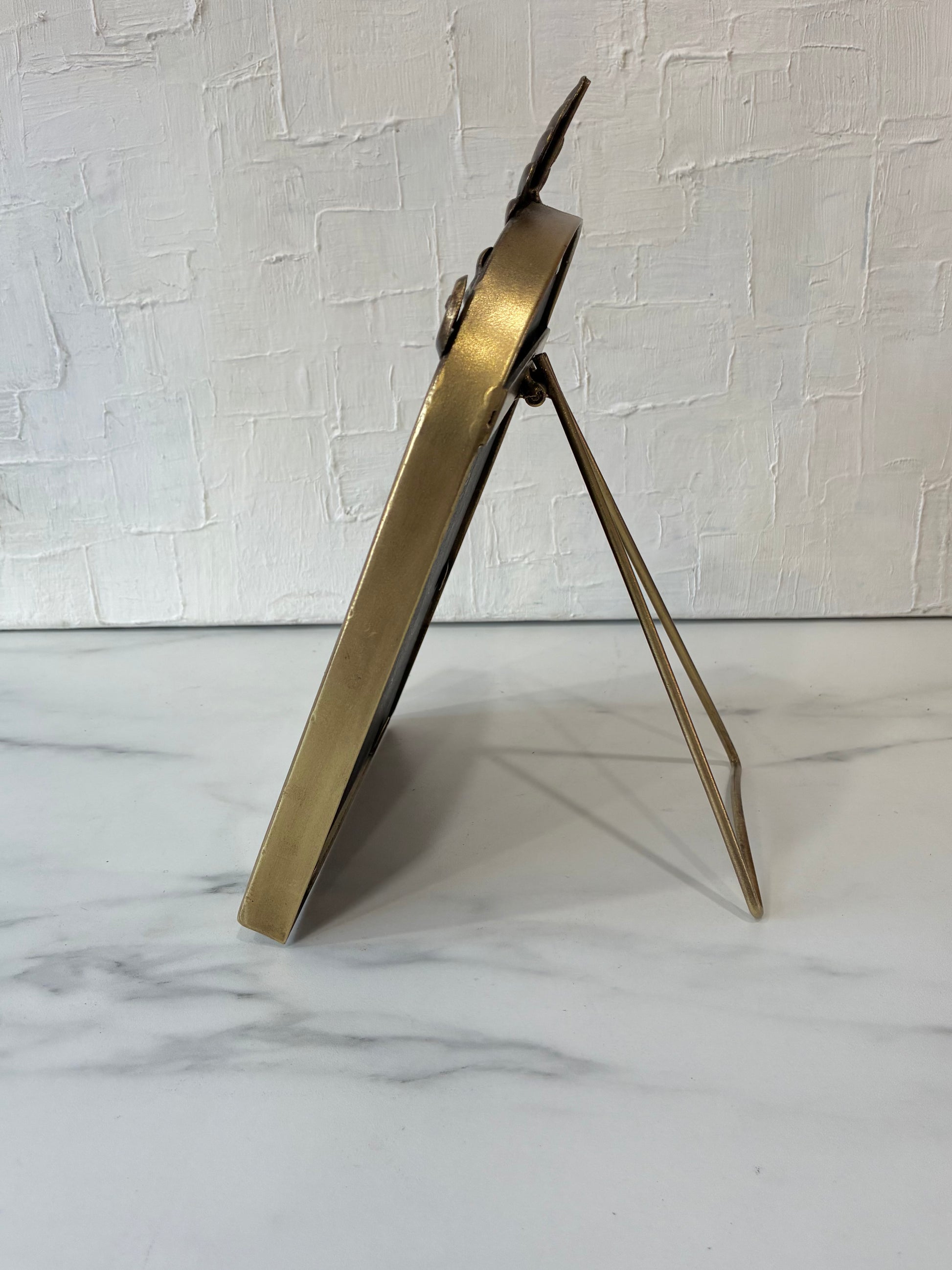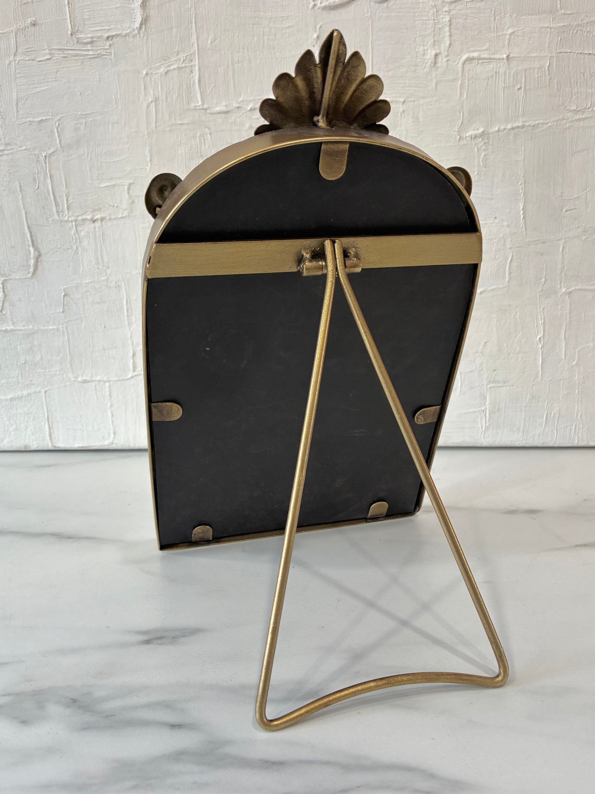 It features a Baroque-inspired design with an ornate garland crown that cascades into an elegantly arched frame. Has a foldable easel for tabletop display, and can also be hung on a wall.