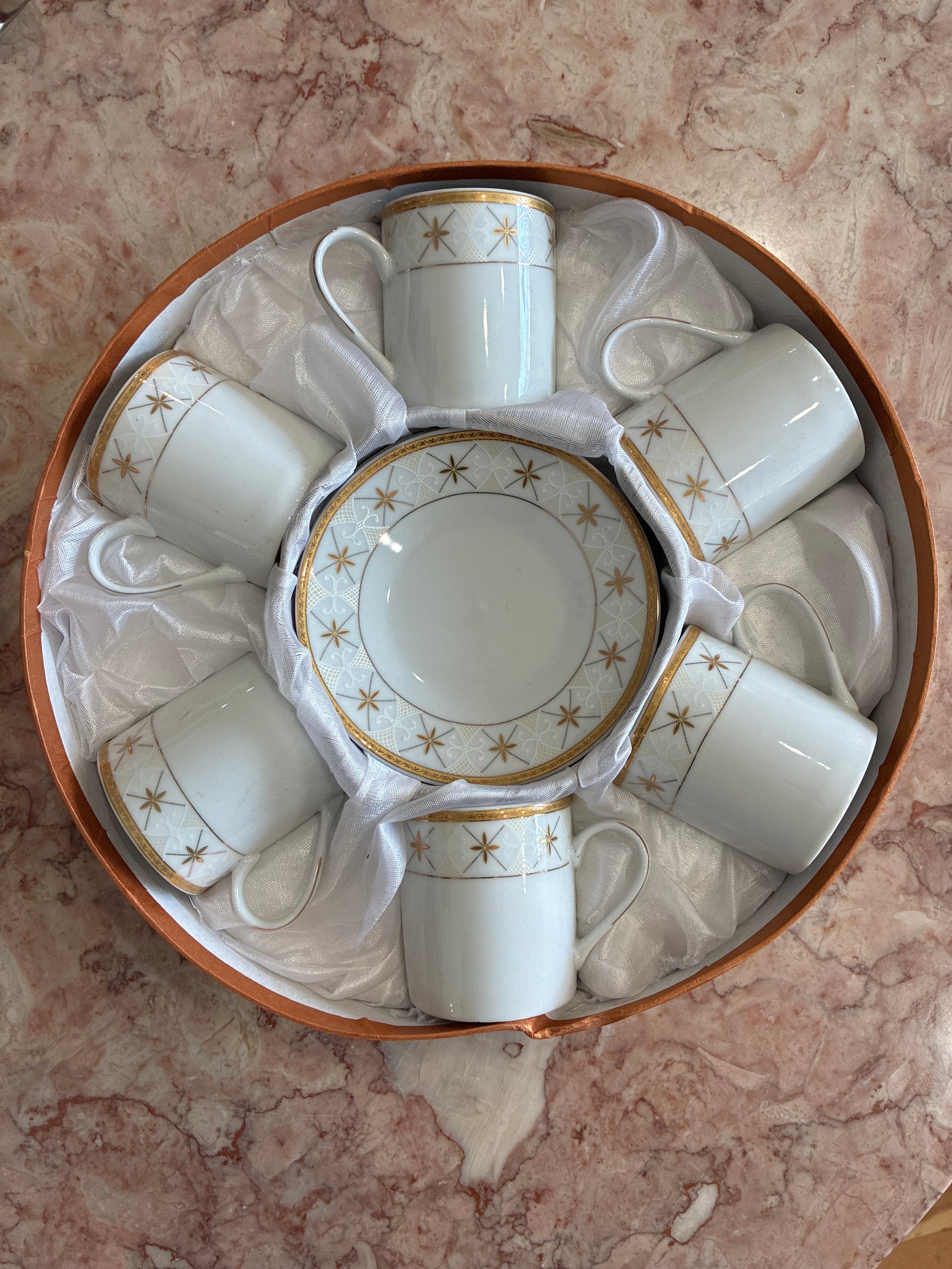 German Fine Porcelain Gold Starburst Cup and Saucer Set of 6 in Box