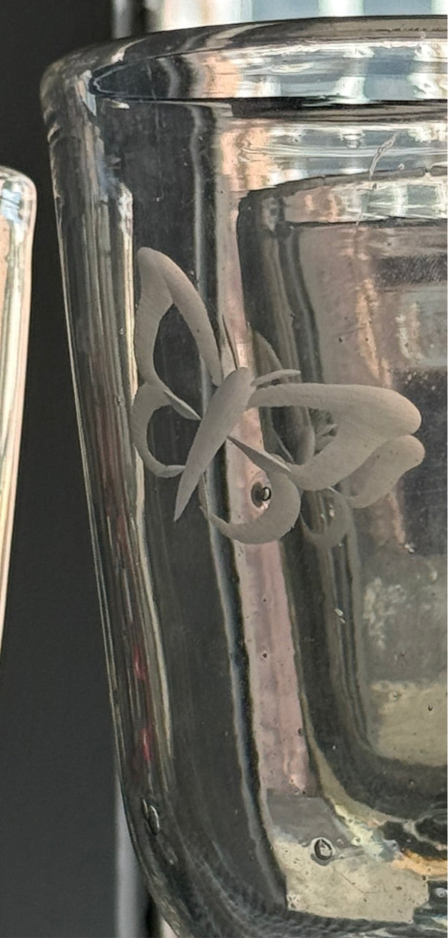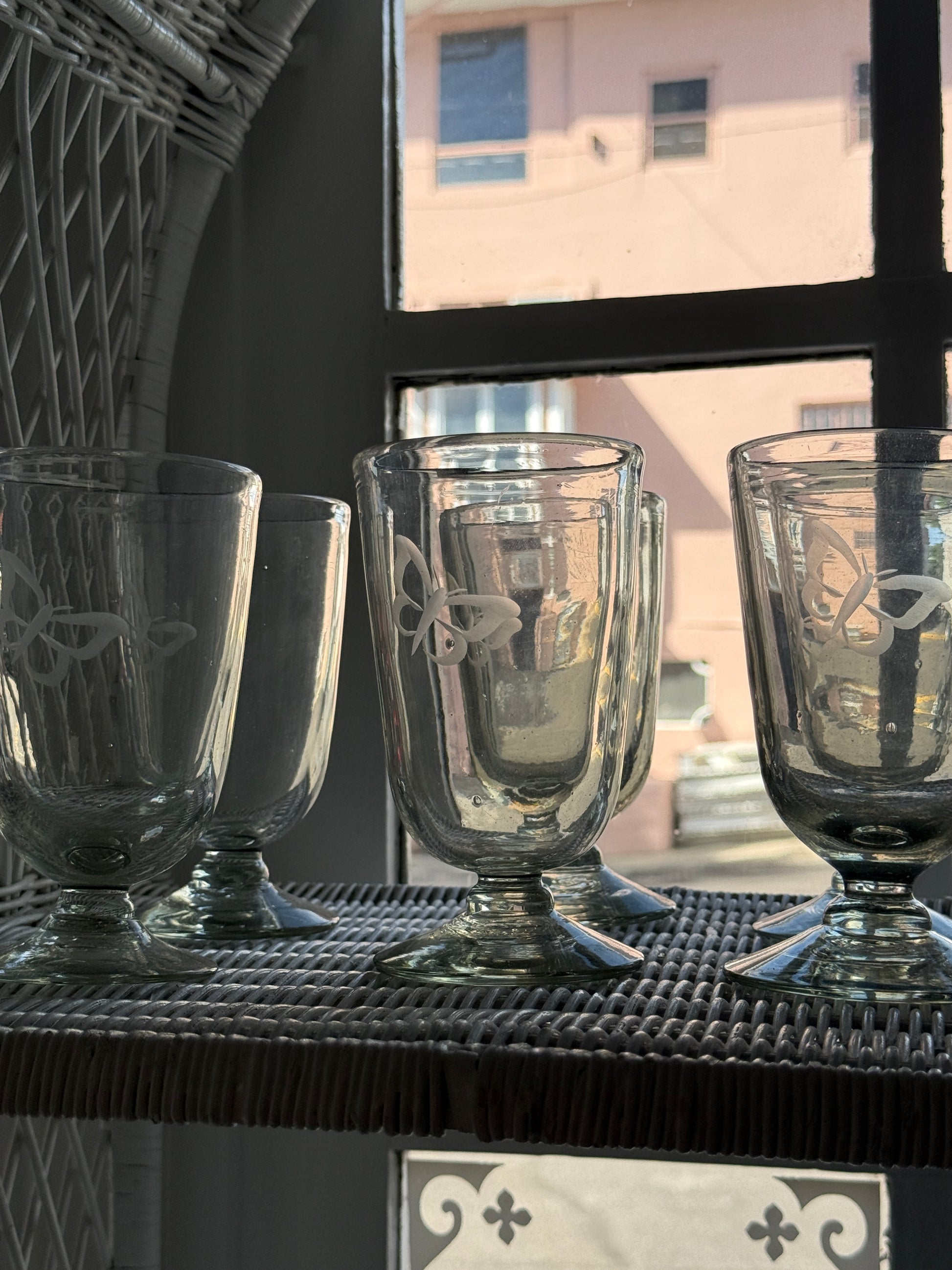 Set of 6, Glass Blown Chalice with a decorative etched butterfly.