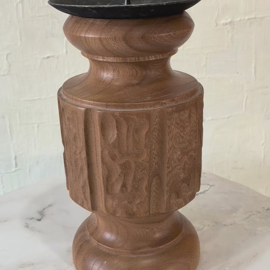 This attractive candle holder features carved designs on its body, and a distressed metal top, equipped with a spike to secure the pillar in place.