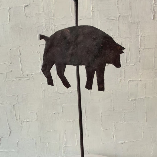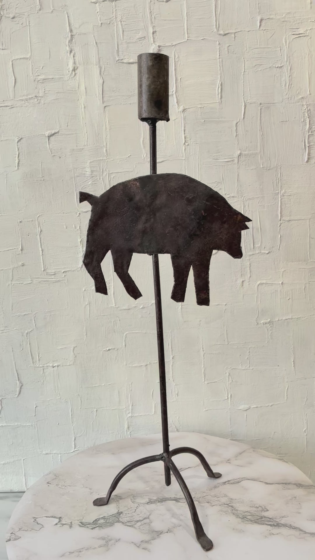 Handmade hand forged iron pig tapered candle holder with tripod legs. Items like these are considered a form of folk art. Has a rustic or farmhouse aesthetic.