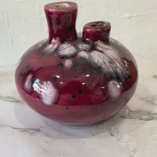 This stunning piece features a distinctive double-spouted design, and is characterized by its maroon, red glaze with black and white drip accents