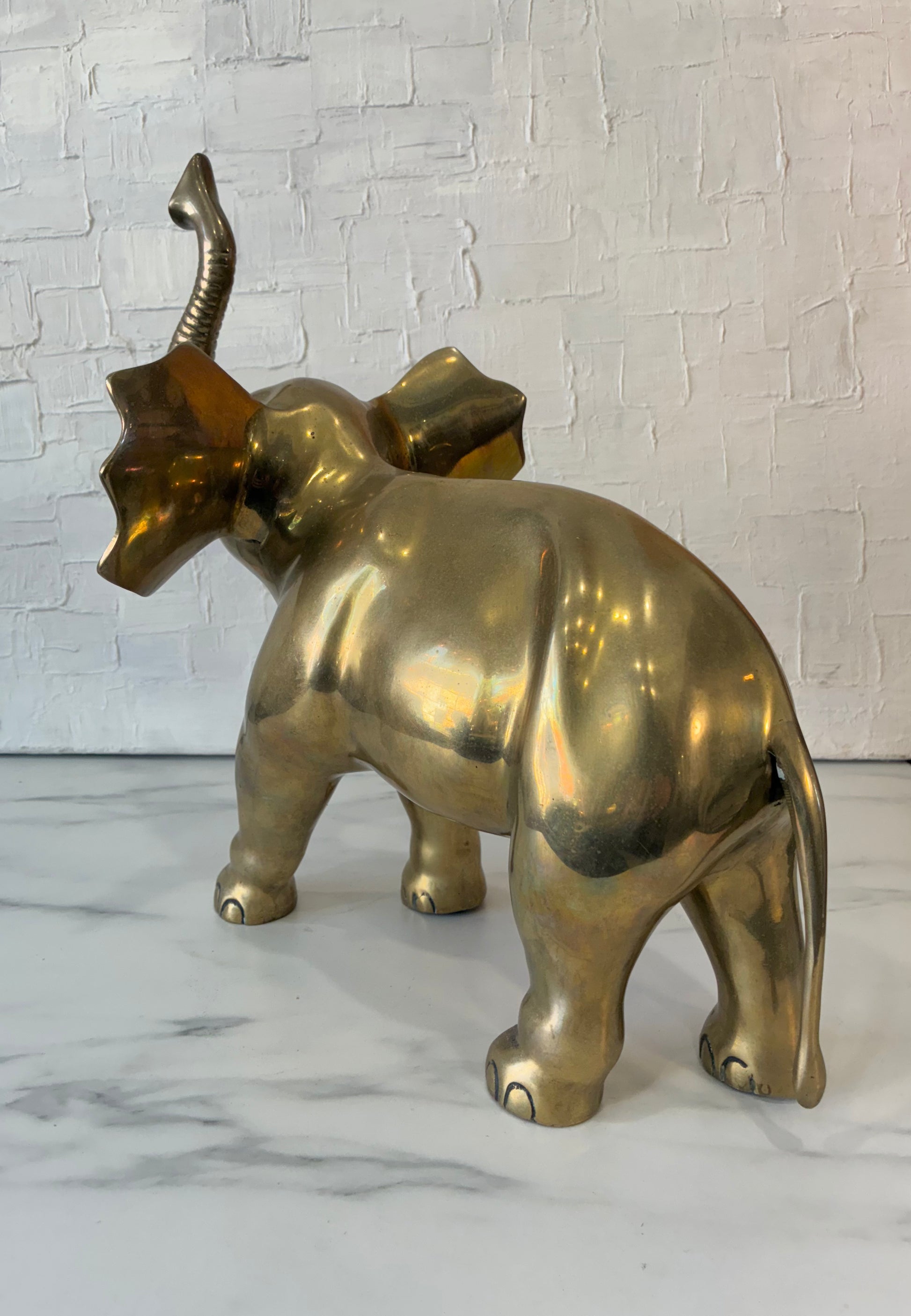 Vintage brass elephant statues were popular in the Midcentury. Due to their aesthetic appeal and symbolic meaning, these brass elephant figures are sought after by collectors. Raised truck is meant to symbolize good fortune and positive energy in a space.