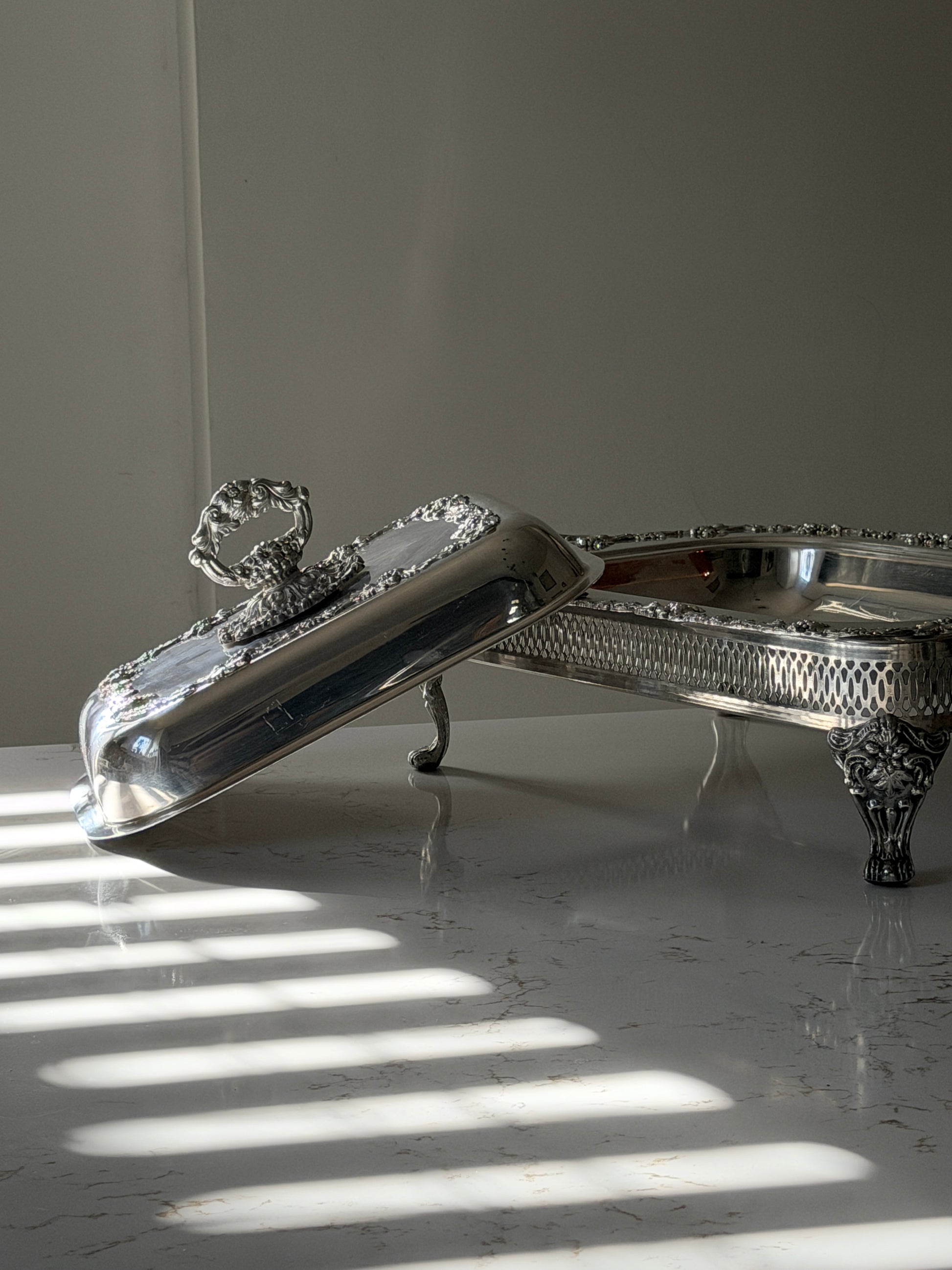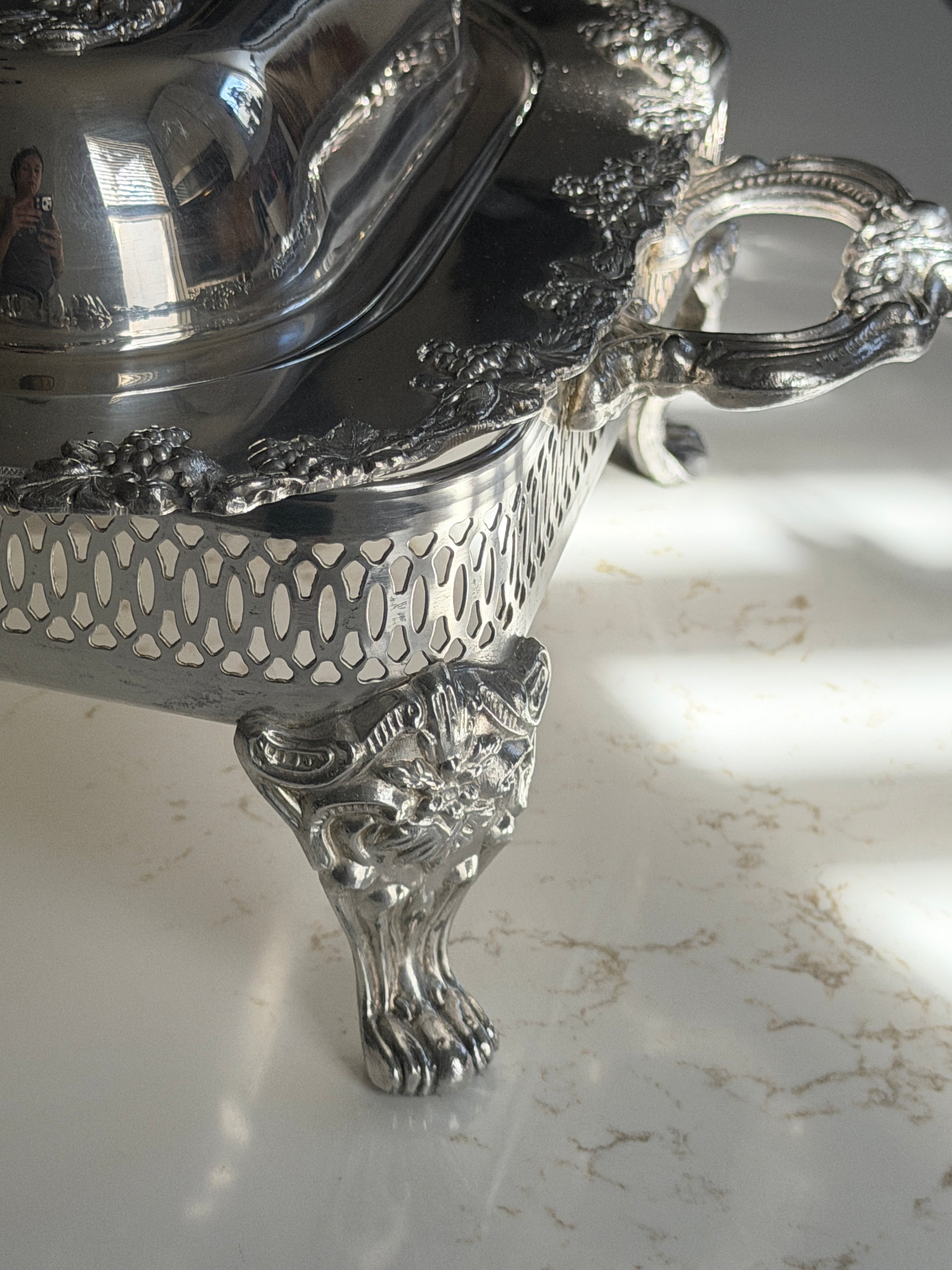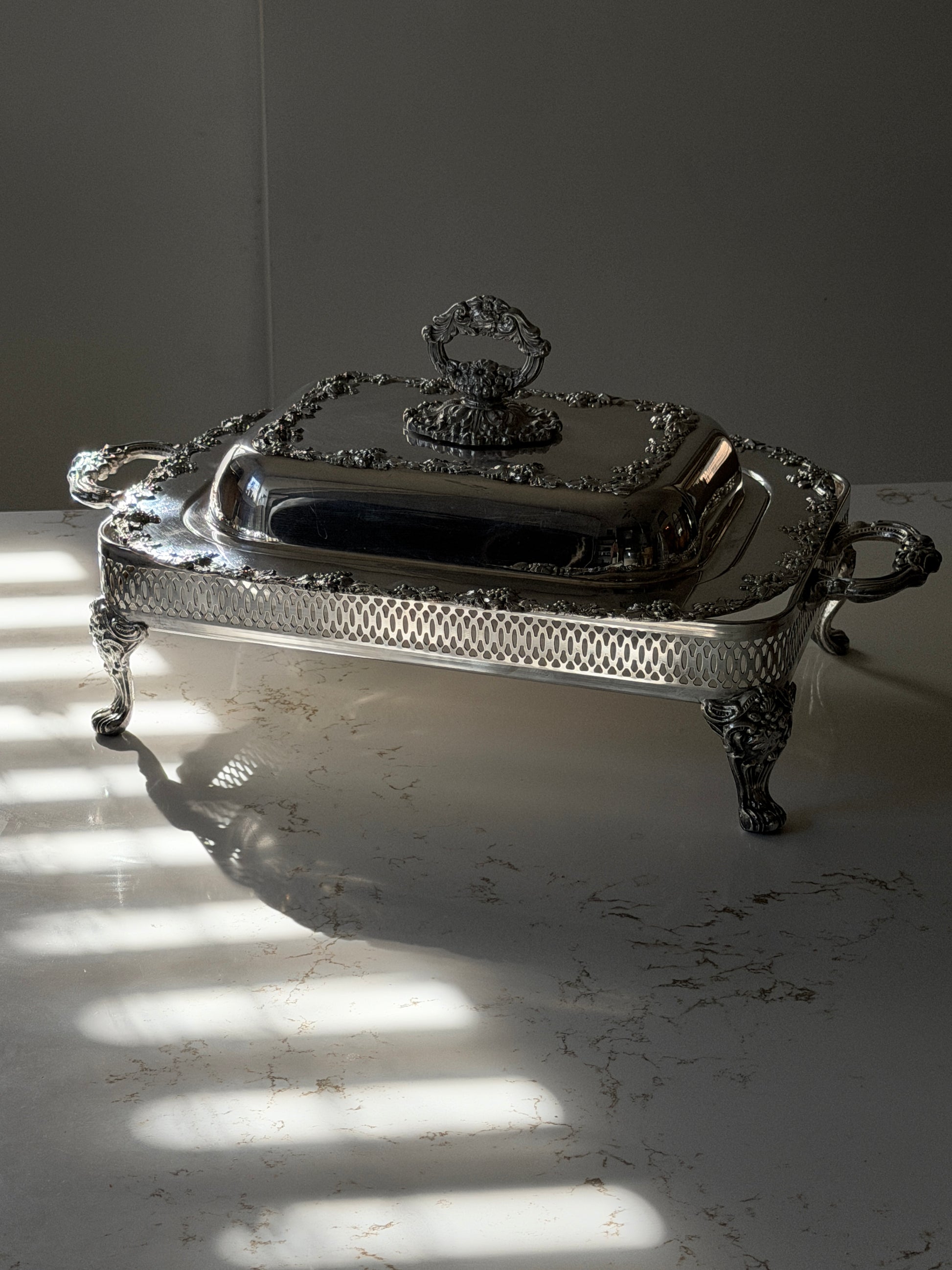 Silver Plated Grapevine Lidded Serving Dish + Stand by Old Sheffield Reproduction