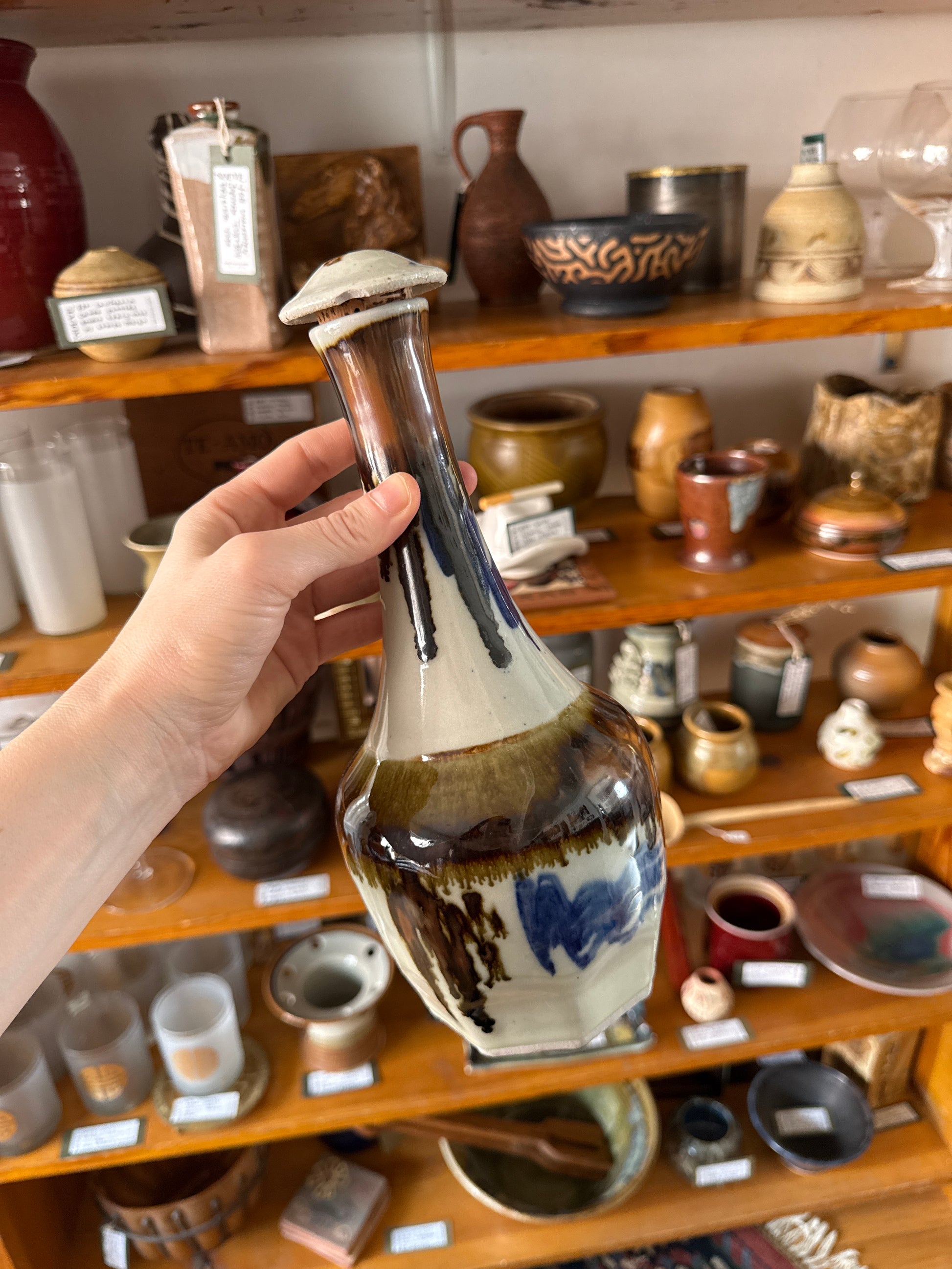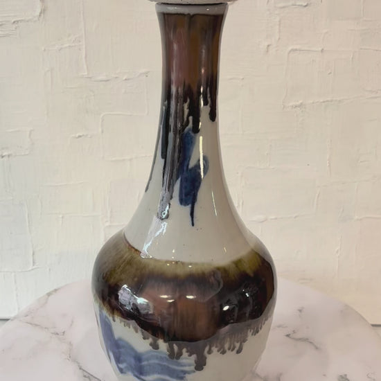 This decanter vase is a distinctive style of ceramic art by Tony Evan’s, an American potter. The decanter has his signature on the bottom.