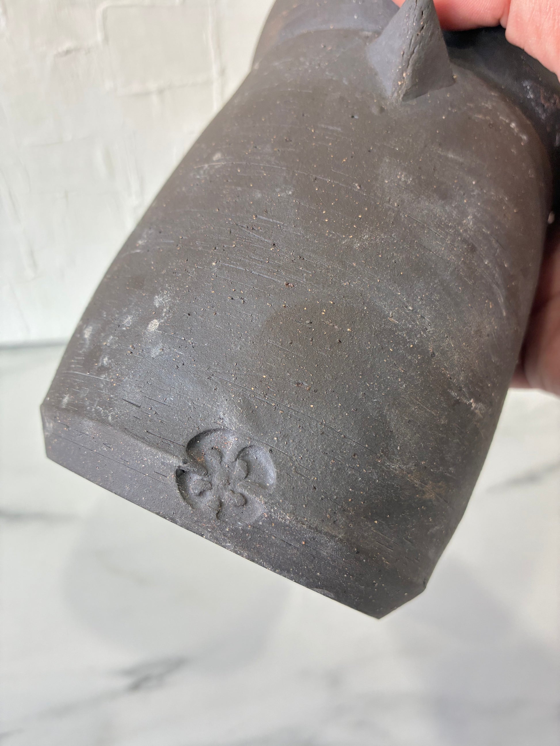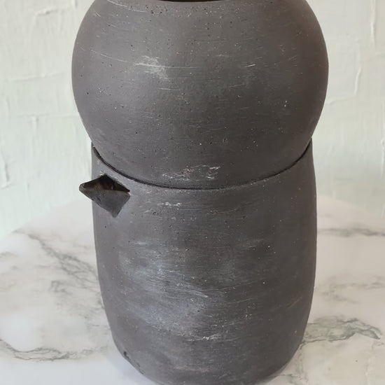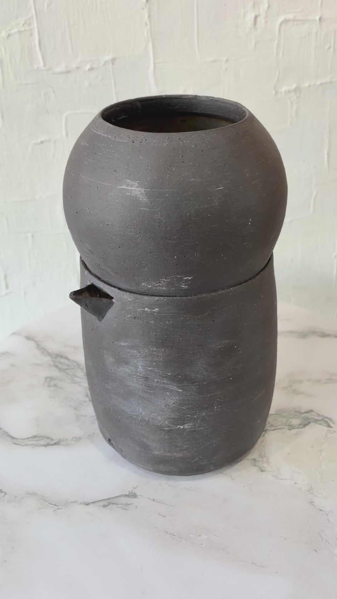 black matte, organic glazed center spout pitcher, gives the illusion of having a separate top and bottom.