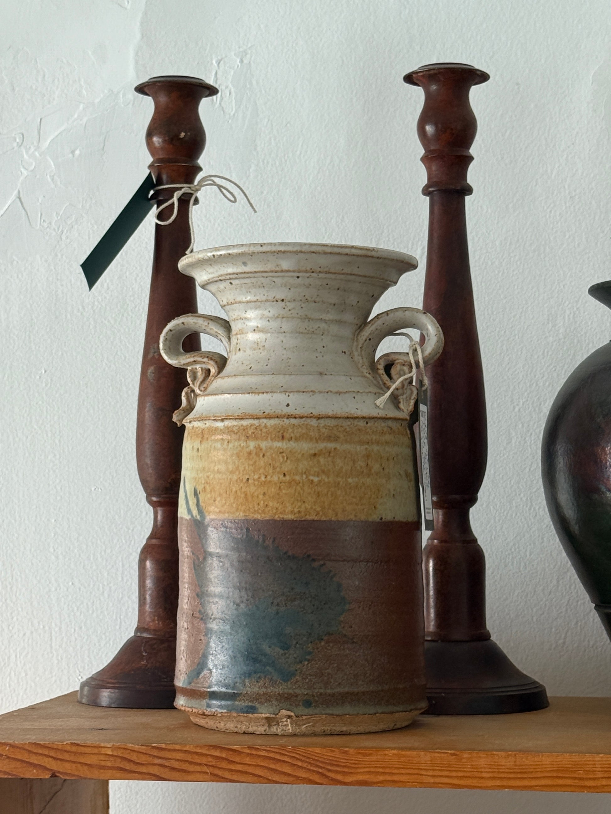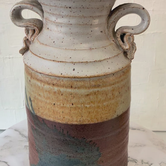 multi-toned glaze, including a speckled cream upper section, a light green band and a reddish-brown base with a darker organic pattern. The spittoon also has two distinctive, scroll-like handles near the top.