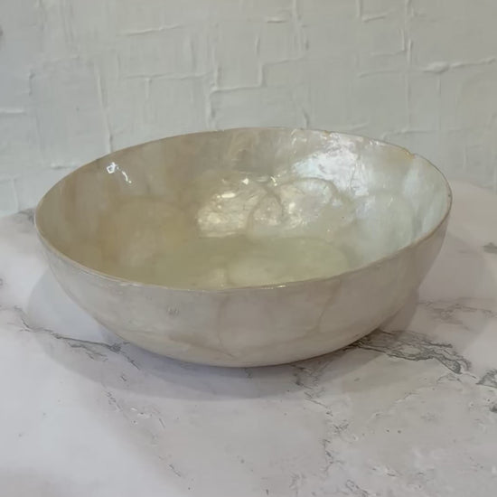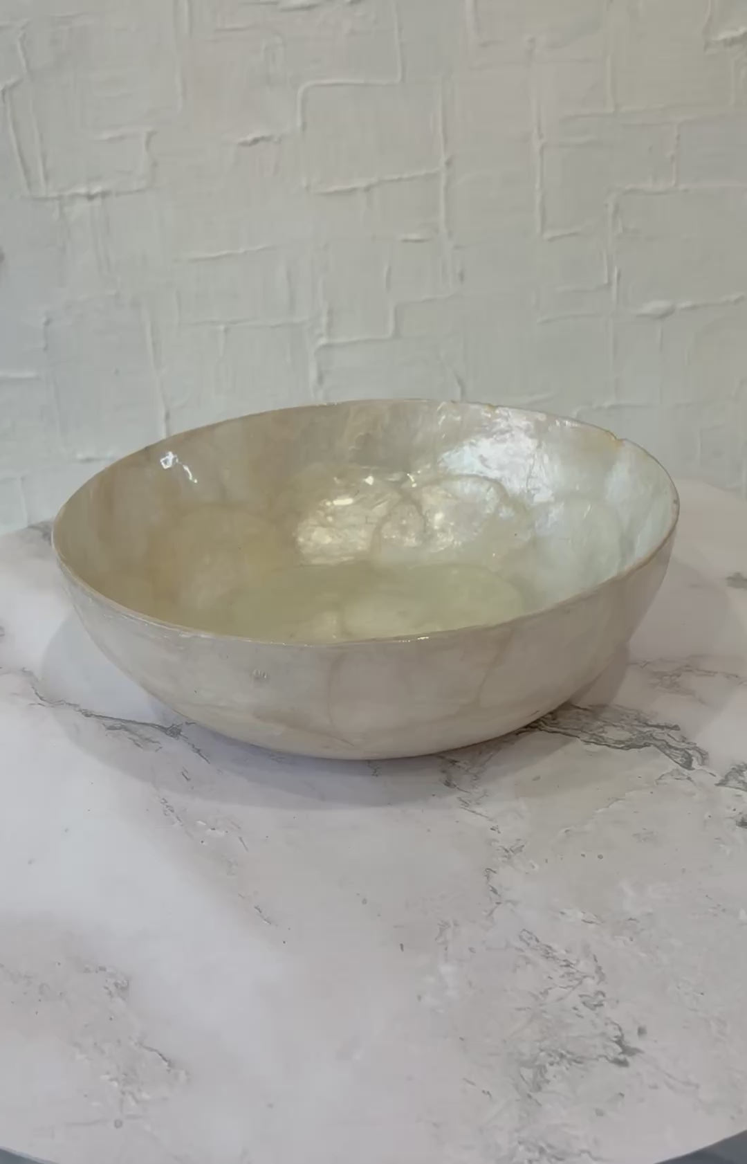 Vintage decorative round catchall bowl made of Capiz shells, also known as windowpane oyster shells. They are sourced from marine mollusks found in shallow coastal waters of the Philippines.