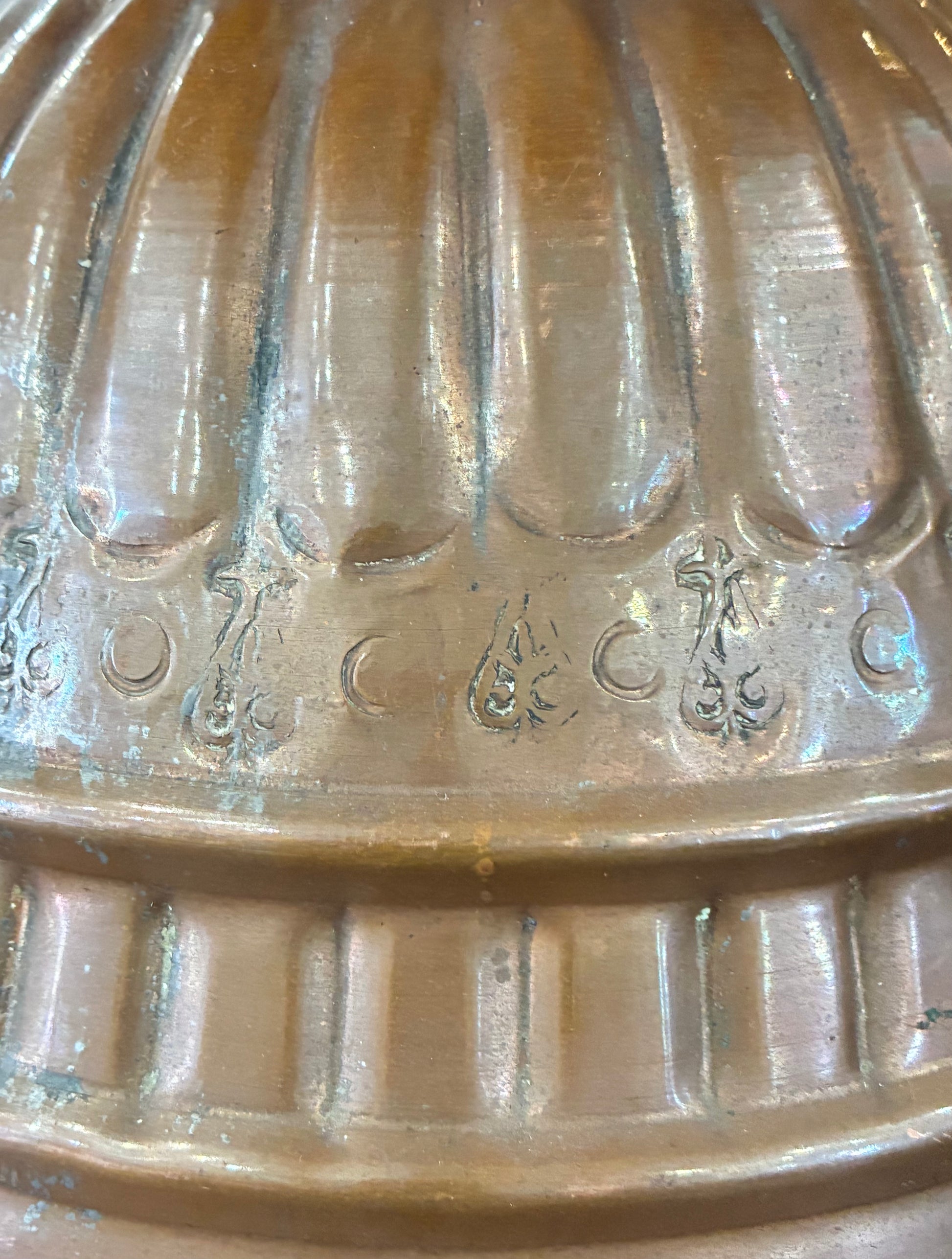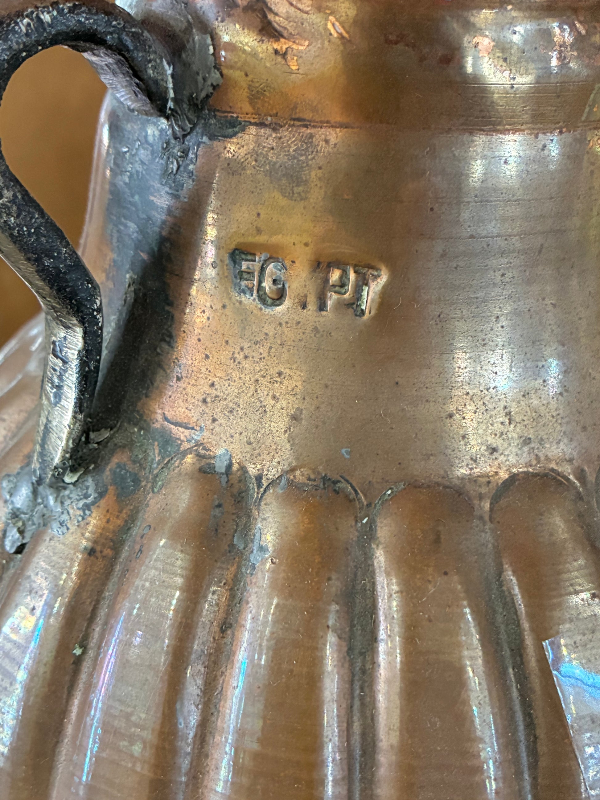 Vintage copper vessel lamp with a Vintage pleated lamp shade adds a classic elegant touch.