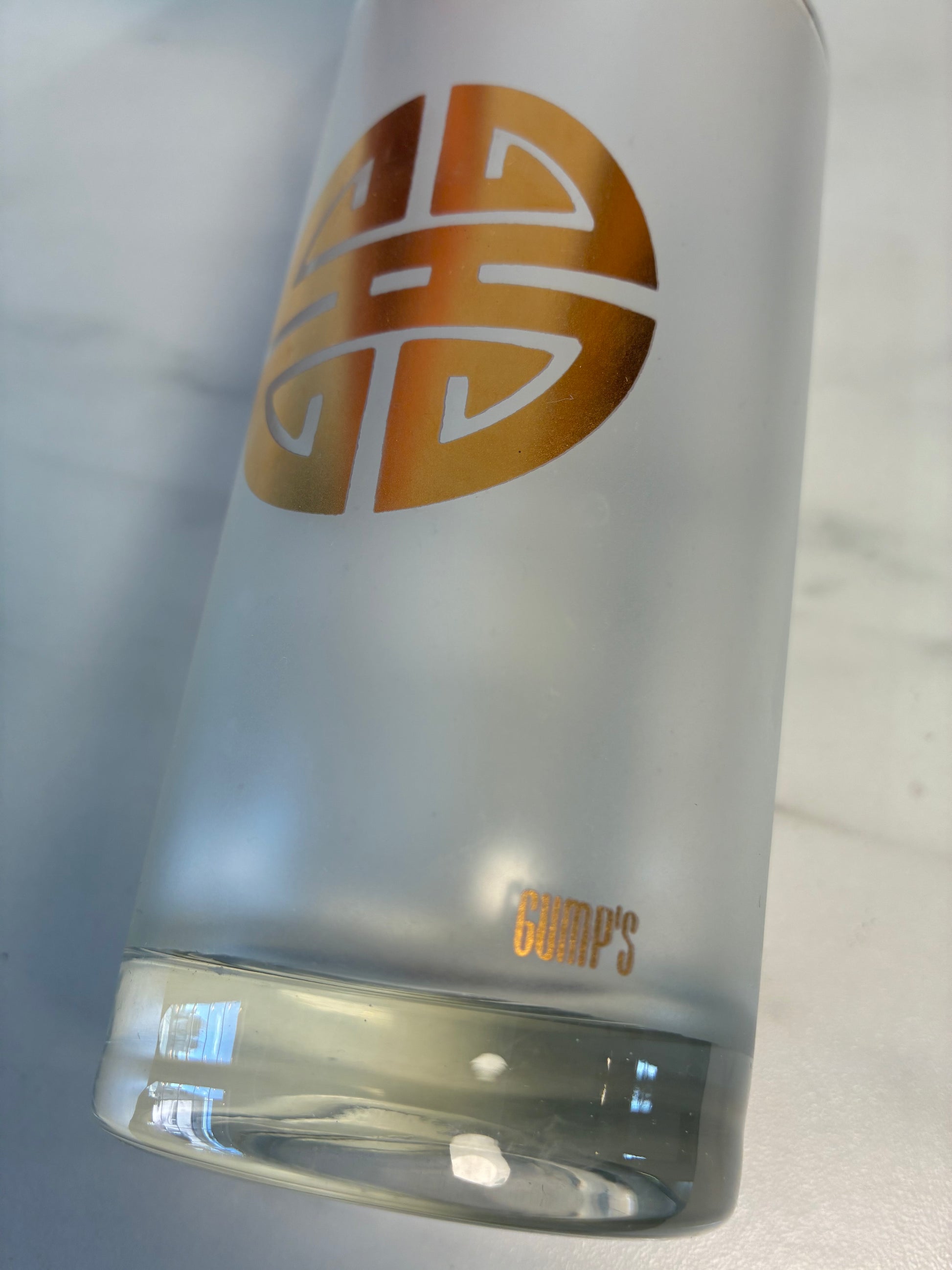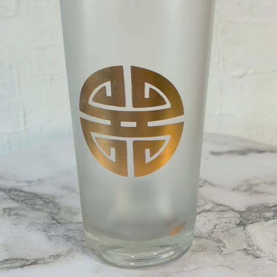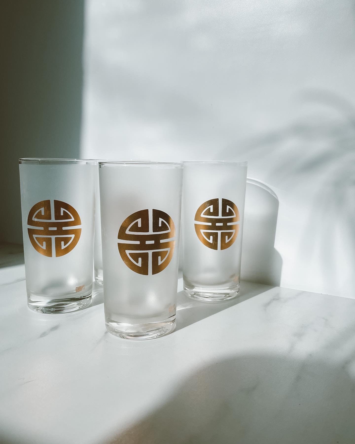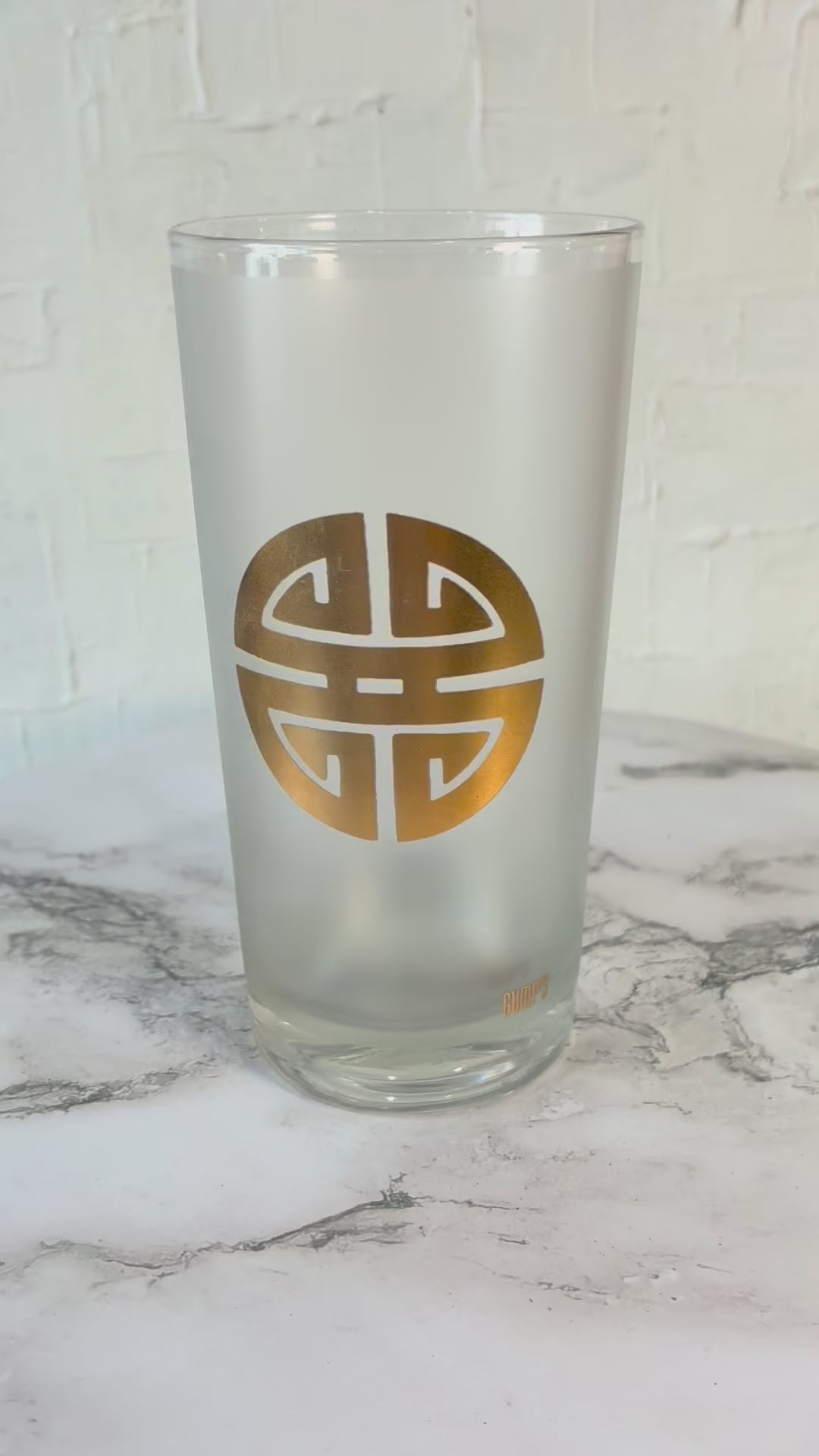 Set of 4, Vintage Gumps High Ball Old Gold Frosted Glasses. Features a frosted finish and a 24K gold Asian Shou symbol. The Shou symbol represents longevity and good fortune in Chinese culture.