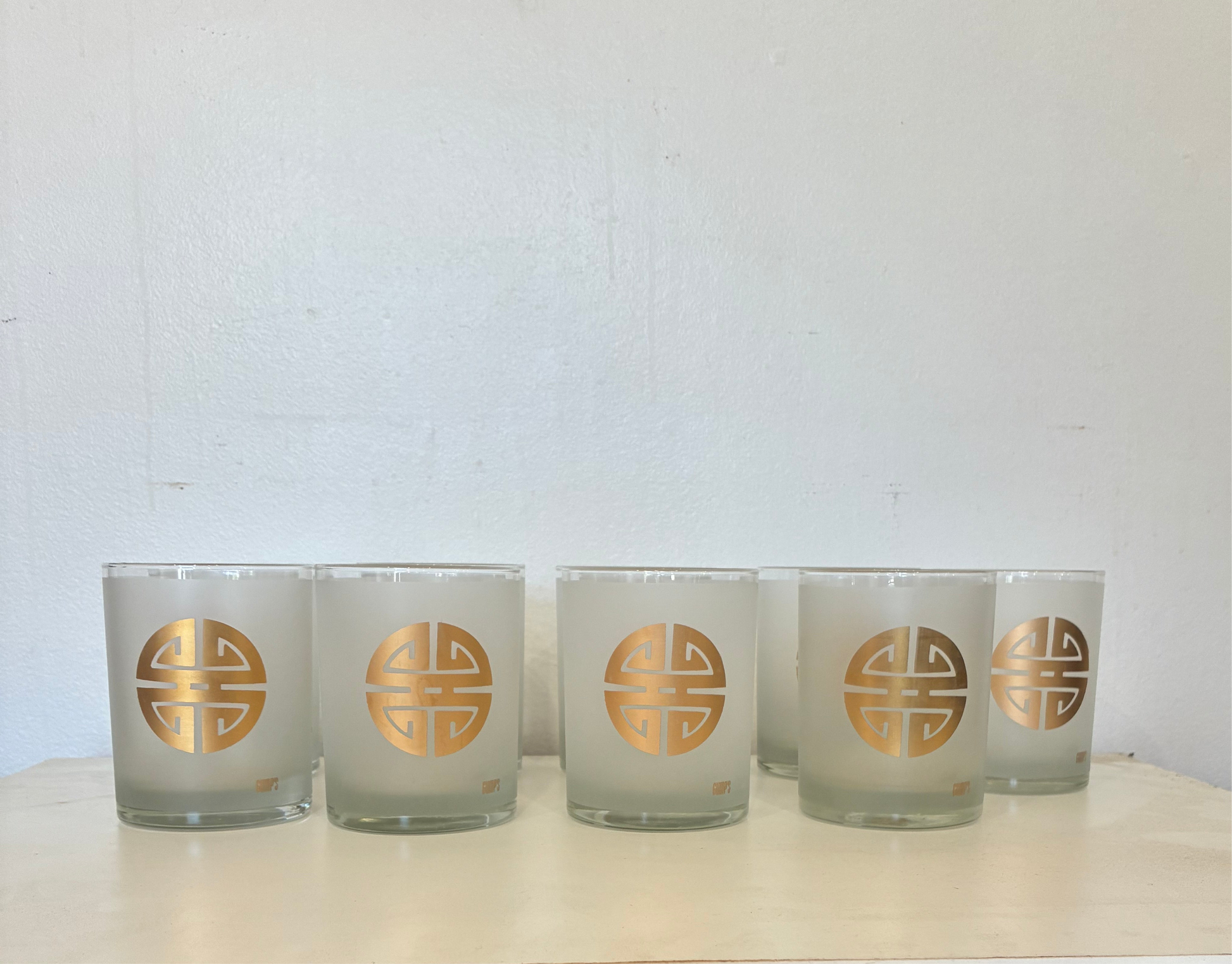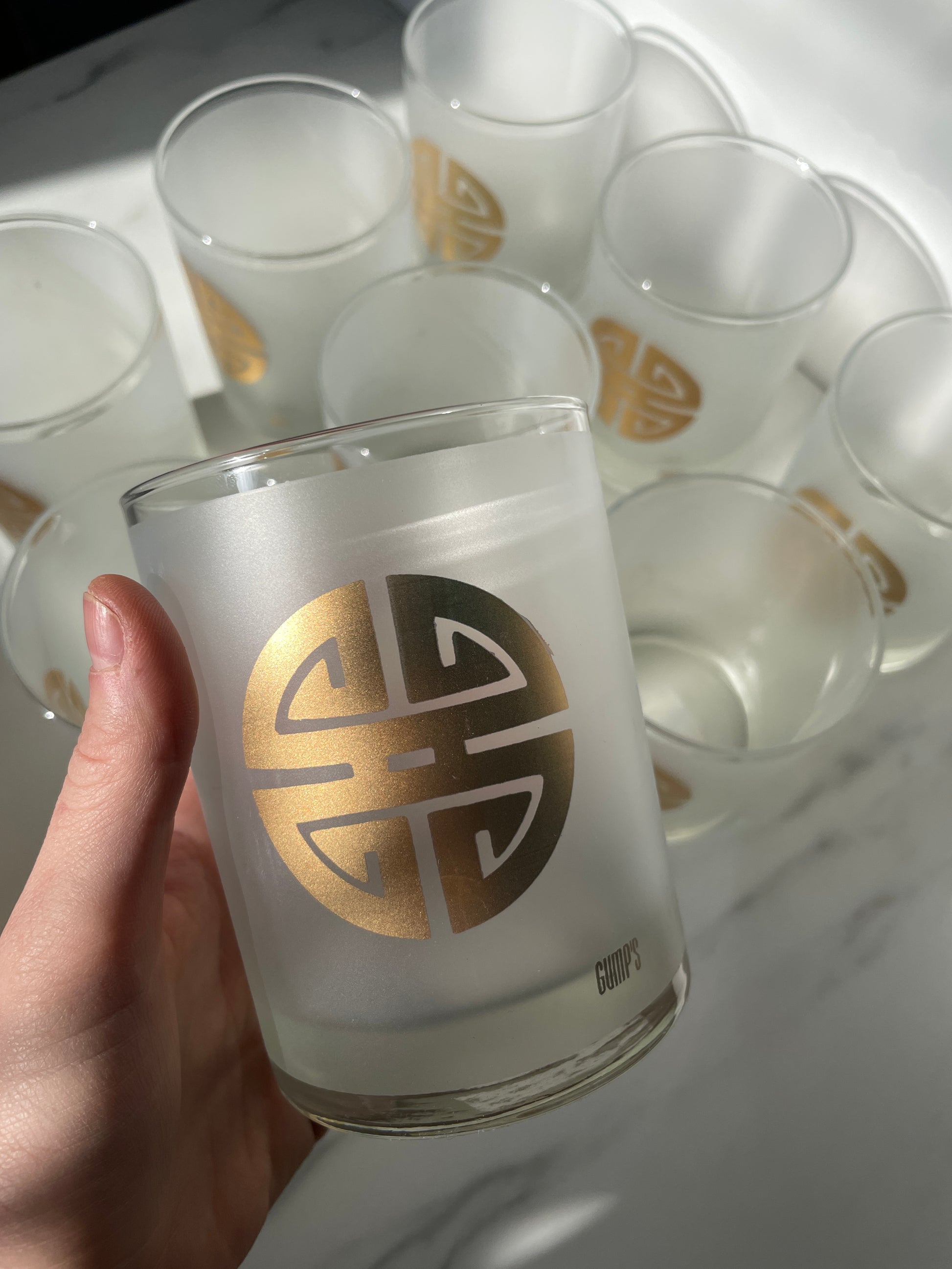 Set of 9, Vintage Gumps San Francisco Old Fashion Whiskey Gold Frosted Glasses