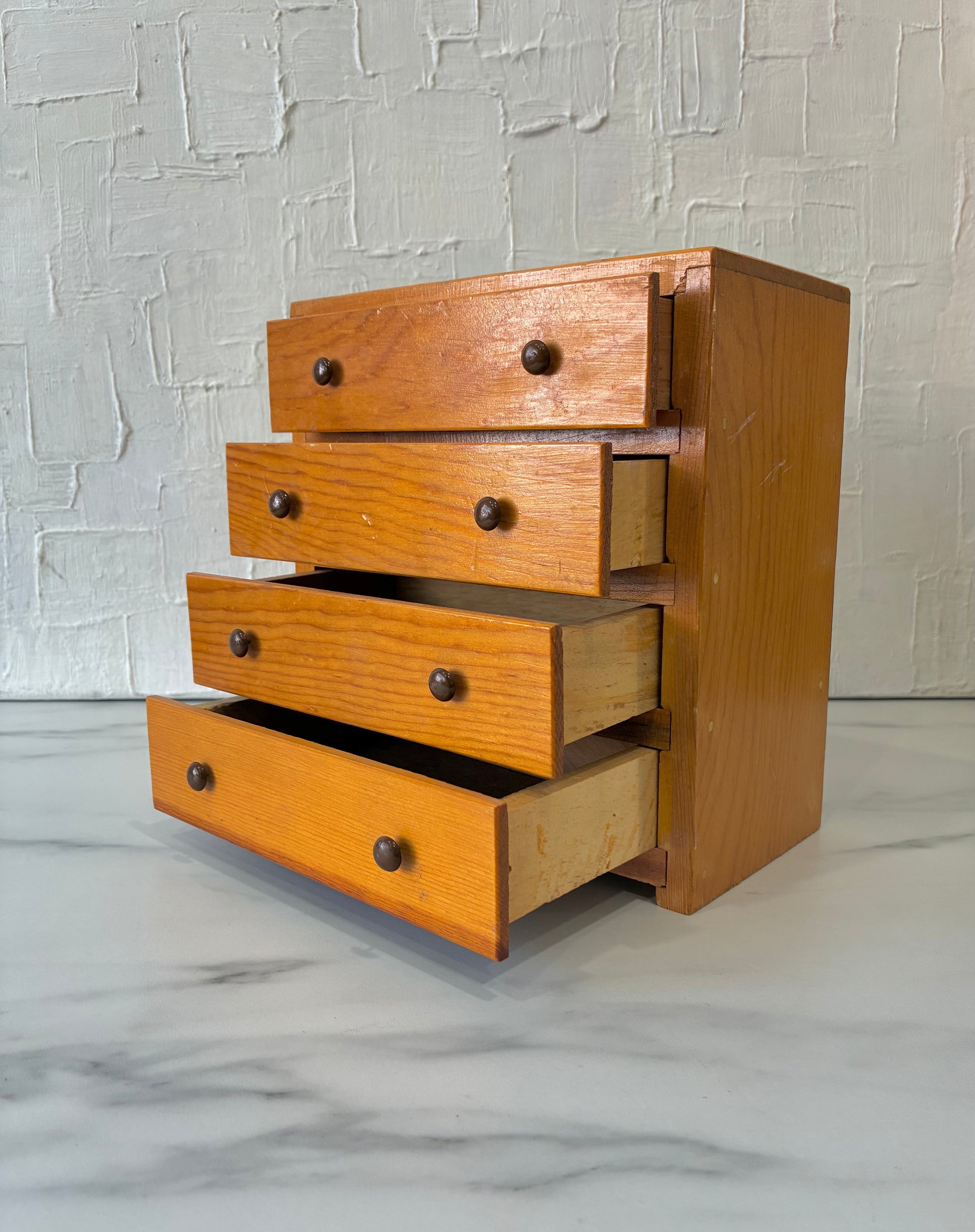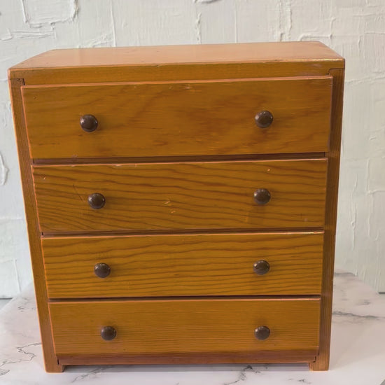 Handcrafted vintage pine, 4 drawer pine jewelry box or tabletop storage cabinet.