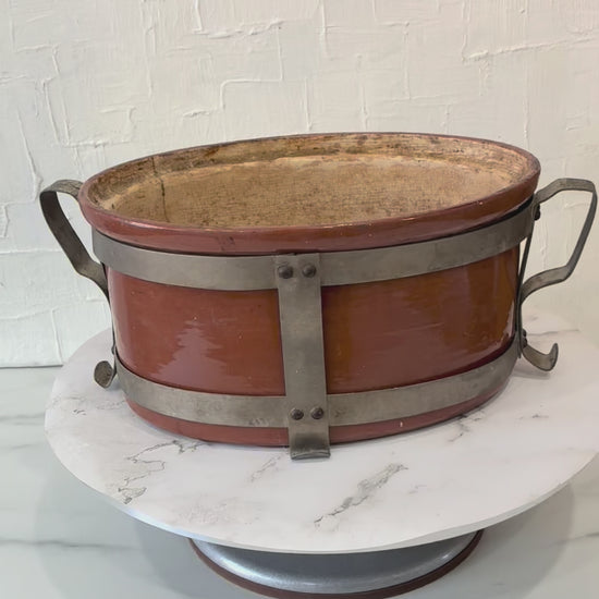 Brown stoneware crock or bowl in made metal stand is an antique Weller pottery piece. Crock is removable from the metal stand.