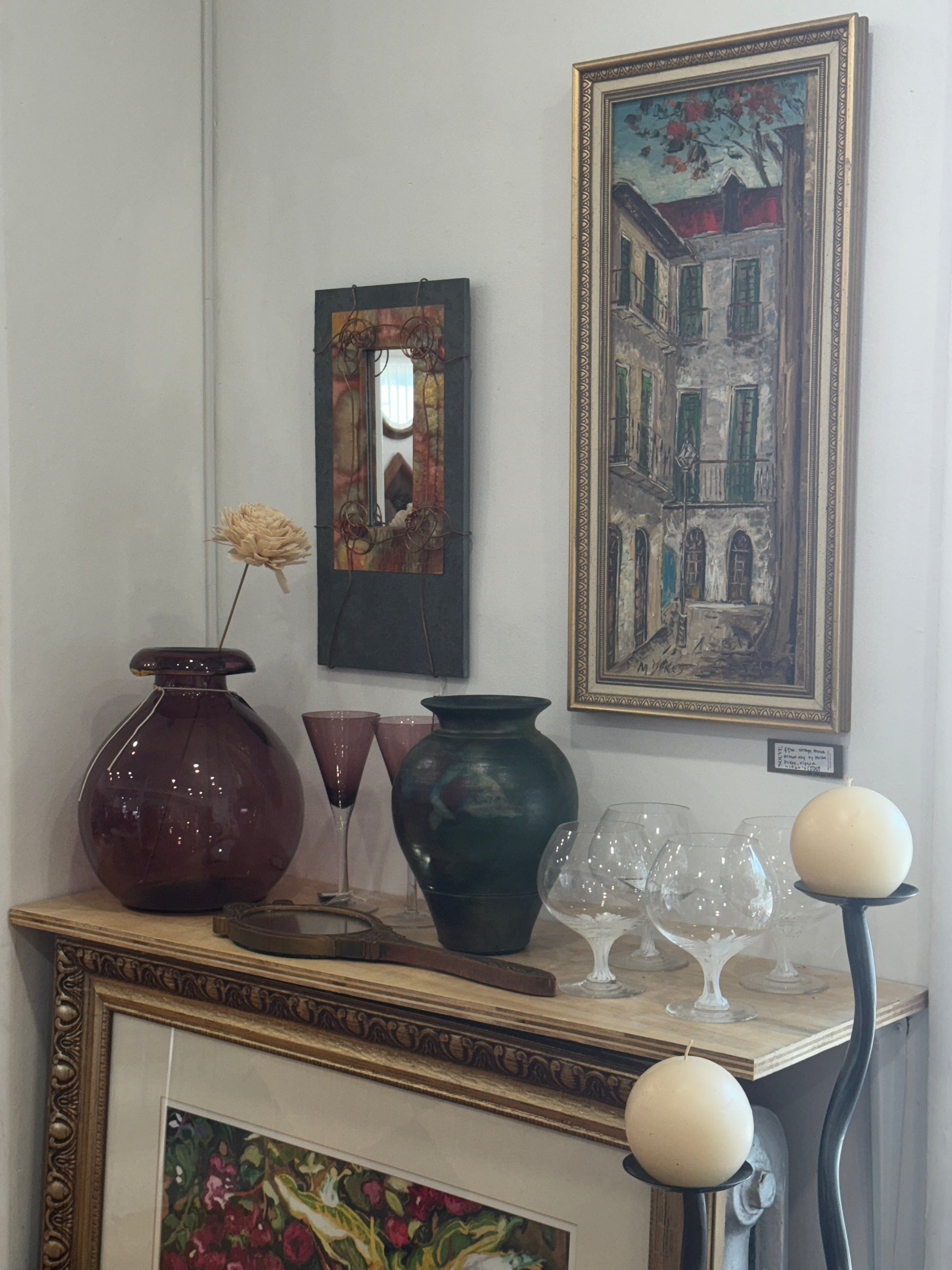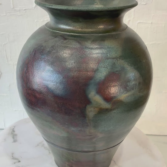 This vase has unique colors and patterns, such as greens, blues and reds. The oxidation process, where the hot pottery interacts with materials create a unique patterns and vivid hues.